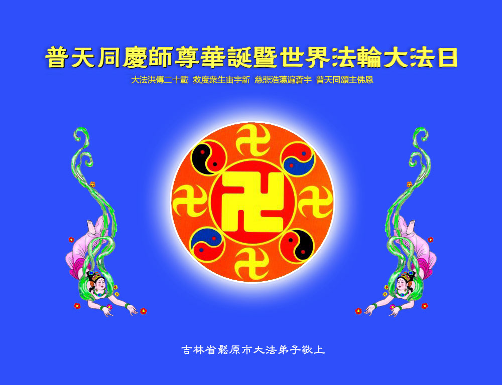 师父家乡弟子恭祝师尊生日快乐!普天同庆世界法轮大法日! 弟子叩拜师恩 公主岭全体大法弟子敬上 吉林省辽源郊区一学法小组恭祝师尊华诞