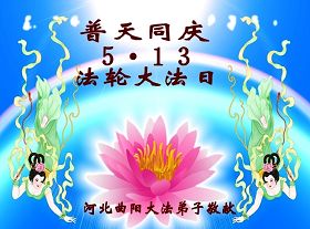 在此法轮大法洪传二十周年之际,我谨代表辽宁省灯塔市全体大法弟子恭祝慈悲伟大的师尊生日快乐!同时庆贺5.13世界法轮大法日! 人间普度二十年,天外正法造宇寰。为使众生能得度,师尊操劳天地间。无量众生喜得救,无量空间与时间。法徒紧随大法船,搜救众生大劫前。不知怎把师恩报,每念师恩泪涟涟!今朝正法已收尾,众生尚在悬崖边。同心同德再精進,满载而归同回天! 河北廊坊五人学法小组恭贺法轮大法洪传二十周年!恭贺慈悲伟大的师尊生日快乐!