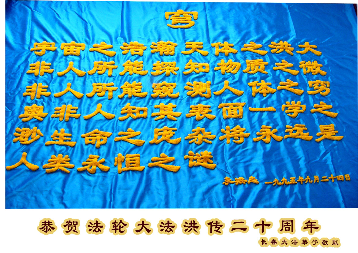 又是一年五一三 大法开传二十年 穹天正法十三载 天地蒙恩喜开篇 法徒信师循正道 沐浴风雨感恩莲 昨夜尚迷撒旦惑 今朝梦醒诺舟璇 三件大事助师路 真相破迷解前缘 信师信法师尊笑 弟子精進一念牵 大法洪势须臾过 再看新宇正穹仙 吉林省辽源市全体大法弟子恭贺法轮大法洪传二十周年