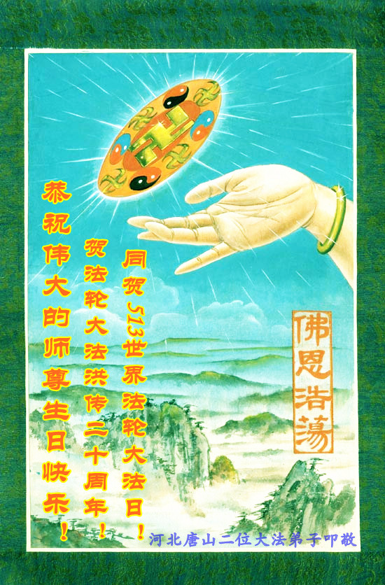 恭贺513法轮大法日,大法洪传二十周年。 永兴全部大法弟子 唐海一大法弟子恭祝师尊生日快乐!并祝贺世界法轮大法日!