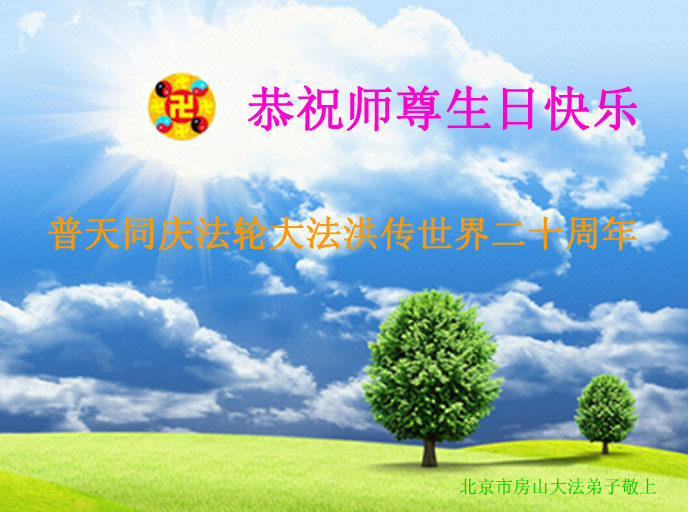 北京市房山区大法弟子恭祝慈悲伟大的师父生日快乐!恭贺法轮大法洪传世界二十周年!庆祝世界法轮大法日! 山东济宁大法弟子一家恭祝师尊华诞,普天同庆5.13世界法轮大法日。