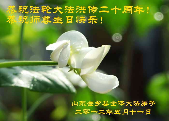 祝师尊生日快乐,祝大法洪传20周年,在这普天同庆的日子,弟子无以言表感恩师尊的慈悲苦度,唯有精進,再進進! 大陆弟子 山东省金乡县全体大法弟子恭祝慈悲伟大的师尊生日快乐!