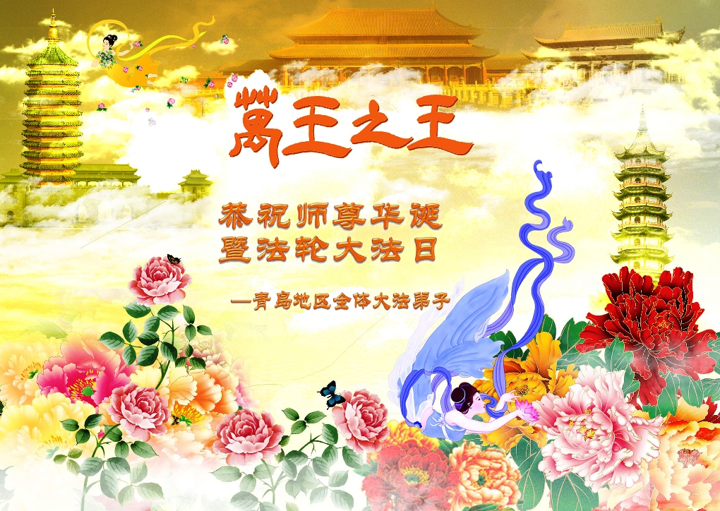 【明慧网二零一二年五月十四日】二十年前的五月,李洪志师父在中国长春将法轮大法公开传出于世,二十年后的今天,法轮大法洪传全球,亿万修炼者在大法“真善忍”的指导下道德升华,获得身心健康。十三年来,每年的五月十三日,世界各地的法轮大法弟子,都向明慧网寄来贺卡贺词,庆祝“世界法轮大法日”,恭贺师尊华诞。这里是明慧编辑部已整理出来的部份来自中国大陆大法弟子的贺卡、贺信。 山东省青岛地区全体大法弟子共贺师尊华诞 祝贺法轮大法日