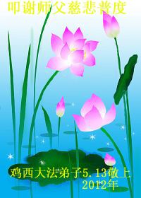 长春市宽城区全体大法弟子恭祝师父华诞!“五一三世界法轮大法日”及法轮大法洪传二十周年。 师尊啊,感恩您的慈悲苦度,谢谢您亲驾法船,载我们归航。万分珍惜您开示给我们的无量天机,谢谢您再造的洪恩。众弟子和得救的世人,一齐向师父献上最最最高的礼赞:同颂您的救度洪恩,师恩浩荡。 在这普天同庆、同贺、同颂“5.13”第十三届世界法轮大法日暨法轮大法洪传二十周年的日子里,众弟子与觉醒的世人用什么样的语言我们才能赞美您——我们伟大的师尊;是您,慈悲伟大的师父将宇宙大法“真善忍”的光辉洒向世界每个角落。这一天,寰宇同庆;这一天,普天感恩。愿我们心灵最深处的对师尊感恩和赞美在宇宙间回响,愿我们永远沐浴“真善忍”的法光中同化大法。 在这普天同庆的日子里—大法弟子向您叩拜:我们不会忘记神的誓言,一如既往做好三件事,肩负起时代重任,助师正法! 我们永远牢记您的佛恩浩荡——大法的福泽,地久天长。 长春市宽城区全体大法弟子向师尊叩拜 二零一二年五月十二 河北省石家庄市辛集市大法弟子恭贺师尊华诞快乐!