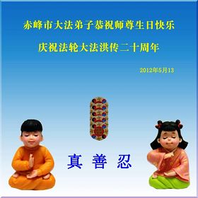 明天是师尊华诞,也是世界法轮大法日。我们两个学法小组全体学员恭祝师尊生日快乐!敬贺法轮大法洪传二十周年!并在未来的日子里,遵照师尊的教诲,做好三件事,直到正法结束。 赤峰两个学法小组全体学员 2012年5月12日 北京大法弟子庆法轮大法洪传二十周年恭祝师尊生日快乐!