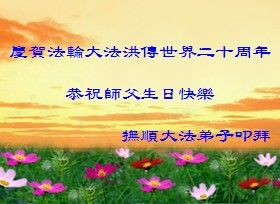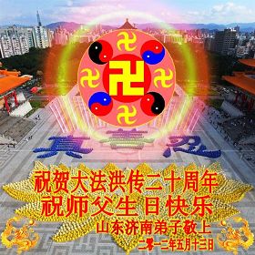 山东省威海大法弟子 江苏无锡全体大法弟子恭祝慈悲伟大的师尊生日快乐!恭祝法轮大法洪传二十周年!