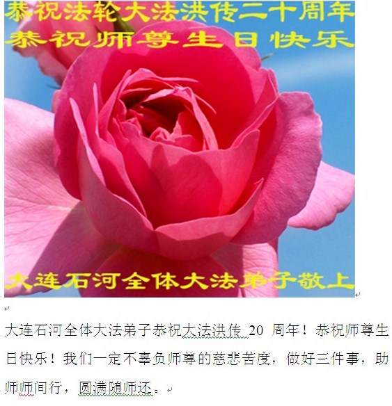 在世界洪传大法二十周年的日子里,弟子非常想念师父,师父为了我们太辛苦,祝师父华诞每时每刻都快乐。 辽宁省大连石河全体大法弟子恭贺师尊生日快乐