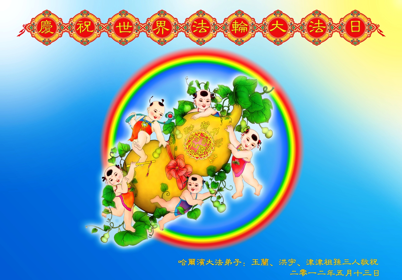 恭贺师尊华诞快乐!普天同庆、同颂、同贺法轮大法洪传二十周年!师尊的慈悲苦度,弟子感恩之心无以言表,弟子们会更加精進,共同学好法,互相配合好,讲好真相,抓紧时间救更多的众生,兑现史前誓约! 辛集市一个学法小组 二零一二年五月十二日 黑龙江省哈尔滨市平房区大法弟子恭祝伟大的师尊生日快乐!庆祝世界法轮大法日!