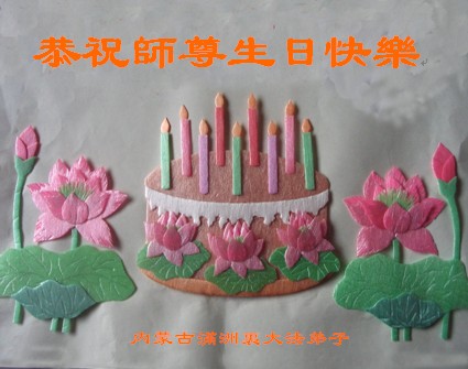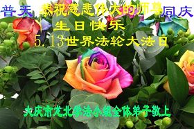 弟子一定走好最后的路,敬请师父放心。 祝愿 (元曲) 大法赐福日经天,同庆“五一三”。 頻祝愿,天下人明真相保平安。 谢佛恩,弟子盼早日见到师尊面。 内蒙古通辽地区全体大法弟子叩拜师尊生日快乐!
