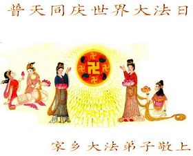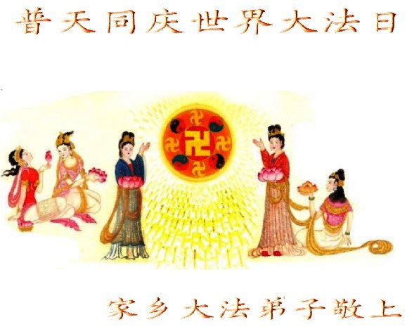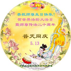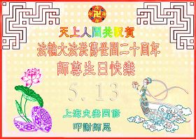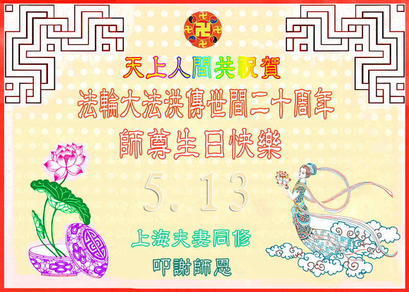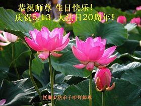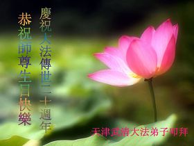 当我怀着无比喜悦的心情迎接“五一三”法轮大法洪传二十周年的时刻,我的脑海里浮现出这样的一幕:奥妙的天宇佛辉映韵,佛光朗朗普照,各上界众佛、道、神纷纷聆听到了远近慈悲的召唤!我们神采愉悦踏着祥云,俩俩相继姗姗而来。此刻我们就相聚在这里——“五一三”世界大法日。 在这普天同庆的日子里,我们山东德州一学法小组欢聚一堂相聚在这里,围坐在师尊的法像前学法、交流、切磋,仿佛又回到了七二零以前,都感到无比的幸福和自豪。我们有得法十几年的老弟子,有得法近两年的新弟子,我们新老弟子都时刻沐浴在师尊的佛恩浩荡之中,处处得到师尊的呵护。 回忆师尊二十年的传法历程,真是千辛万苦语难尽。师尊您为弟子们承受着一切耗尽全部的心血,扶我们一步步走正。可我们做为您的弟子许多地方做的不好、不精進,真是对不起师尊的慈悲苦度,让师尊操尽了心,真是无颜面对师尊。我们大家都向内找。回顾修炼路上的成与败、得与失,扪心自问是否符合修炼人的标准?是否对的起师尊赐予我们的荣耀?师尊在新经文《选择》中说:“大法徒与受难的觉者有什么两样?”师尊把弟子们放在觉者的位置,我们可真得对的起这致高无上的荣誉啊! 师尊您就放心吧!您的弟子们会在最后的日子里、在最关键的时刻走正,做好三件事跟上正法進程,真正做到助师正法。同修们啊精進吧!让我们手牵着手相互提醒,达到整体提高整体升华。同修们啊!我们还有什么放不下的呢?什么事能比这正法时期的大法弟子更重要呢?什么事能比这觉者的荣耀更重要呢?多少众生等着去救啊!因为大法弟子是世人得救的唯一希望。同修们啊快行动起来吧,抓紧救人兑现誓约。师尊您就放心吧!我们一定能做好,一定能圆满随师还! 山东德州大法弟子敬上 上海夫妻同修祝贺法轮大法洪传世间二十周年!师尊生日快乐!