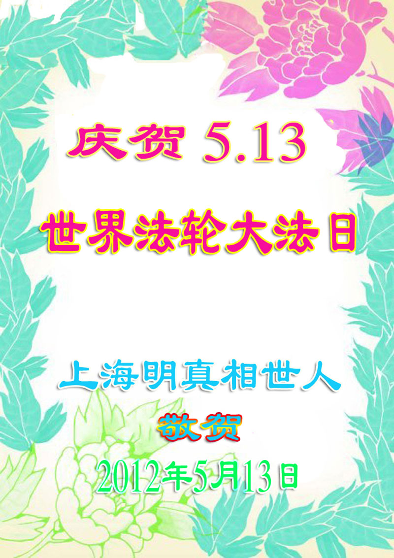 【明慧网二零一二年五月十四日】二十年前的五月,李洪志师父在中国长春将法轮大法公开传出于世,二十年后的今天,法轮大法洪传全球,亿万修炼者在大法“真善忍”的指导下道德升华,获得身心健康。十三年来,每年的五月十三日,世界各地的法轮大法弟子,都向明慧网寄来贺卡贺词,庆祝“世界法轮大法日”,恭贺师尊华诞。这里是明慧编辑部已整理出来的部份来自中国大陆大法弟子的贺卡、贺信。 牡丹江大法弟子庆祝世界法轮大法日