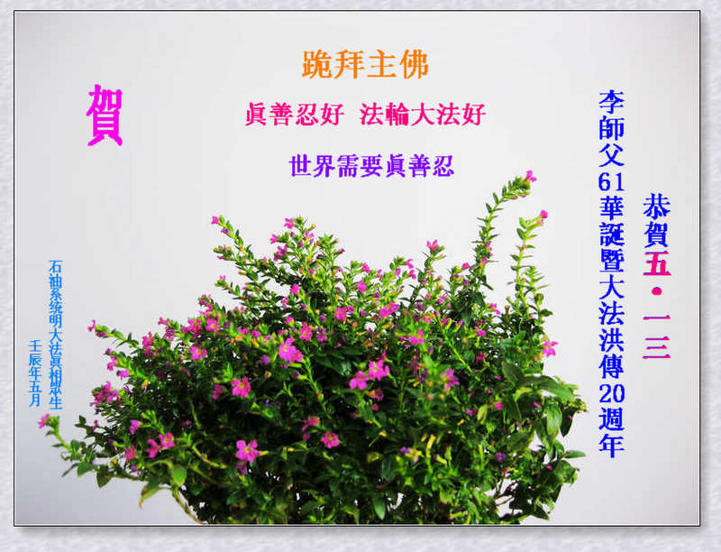 小弟子叩拜并恭祝师尊生日快乐!恭祝大法洪传二十周年! 大法洪传二十年 众生明白真相显 弟子牢记真善忍 助师正法要抓紧 吉林省长春大法弟子庆祝法轮大法洪传二十周年!