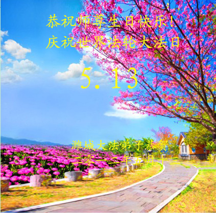 在法轮大法洪传世界的伟大殊胜、幸福之时,我们迎来了“五一三”、“世界法轮大法日”。全球亿万大法弟子、众生、世人“普天同庆”师尊生日(六十一华诞)、喜迎师尊正法获全胜归来!在这伟大、神圣的时刻,我们陕西宝鸡陈仓区全体大法弟子从心中深深的感恩:“师父,您辛苦了!”是您以巨德巨善的伟大慈悲将伟大的佛法“真、善、忍”(《转法轮》)洪传于世界一百一四个国家,救度了苍穹、宇宙中无量无计的生命!是您为弟子净化身心、人心向善、道德回升、绝处逢生获得了新的生命!是您为弟子操尽了心、耗尽了心血,引领、呵护我们走到了今天……千言万语难以表达您对苍穹、宇宙无量无计众生的慈悲救度之恩!我们永记佛法“真善忍”!我们永记“佛恩浩荡”!在这最后的正法進程中,我们谨遵师父的大法,按照师父的要求:“越到最后越不能放松,越到最后越要学好法,越到最后正念要越足。”(《二零零七年纽约法会讲法》)勇猛精進!持之以恒,学好大法,正念除恶,抓紧救人,发挥整体更大的威力!兑现誓约,走向圆满,跟随师父回家园! 湖北省武汉汉阳俩人学法小组恭祝师尊生日快乐!恭祝大法洪传二十周年!
