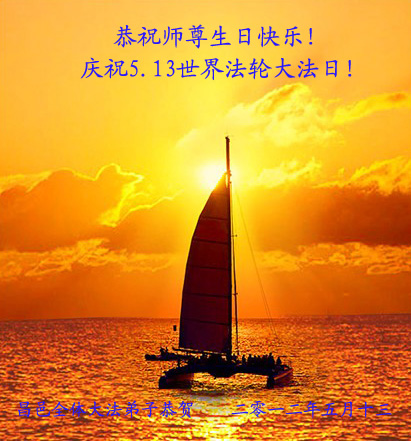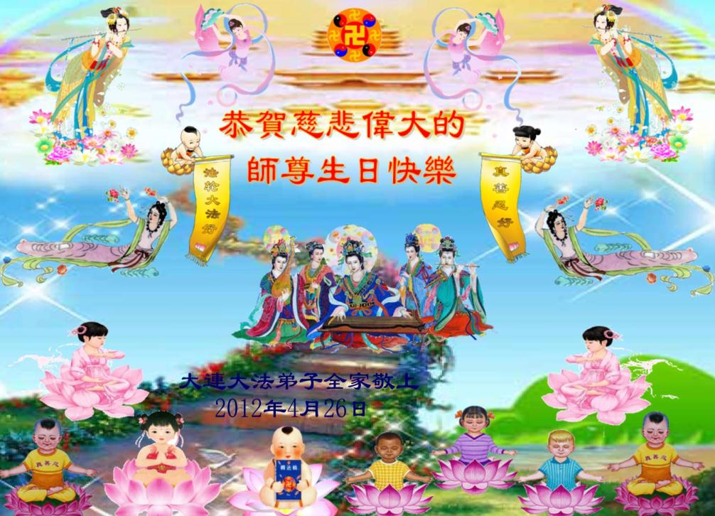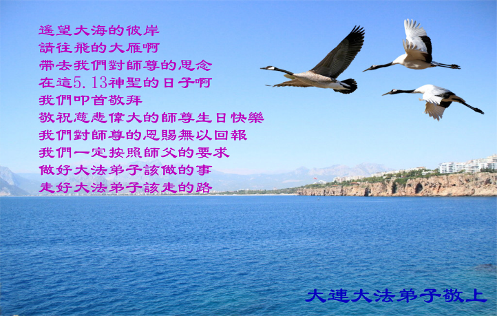 遥望大海的彼岸 请往飞的大雁啊 带去我们对师尊的思念 在这5.13神圣的日子啊 我们叩首敬拜 敬祝慈悲伟大的师尊生日快乐 我们对师尊的恩赐无以回报 我们一定按照师父的要求 做好大法弟子该做的事 走好大法弟子该走的路 大连大法弟子敬上 大連大法弟子恭祝慈悲伟大的师尊生日快乐!