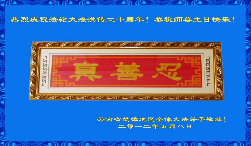 云南省楚雄州楚雄市地区全体大法弟子恭祝师尊生日快乐!热烈庆祝法轮大法洪传二十周年!(全手工十字绣“真、善、忍”)