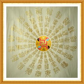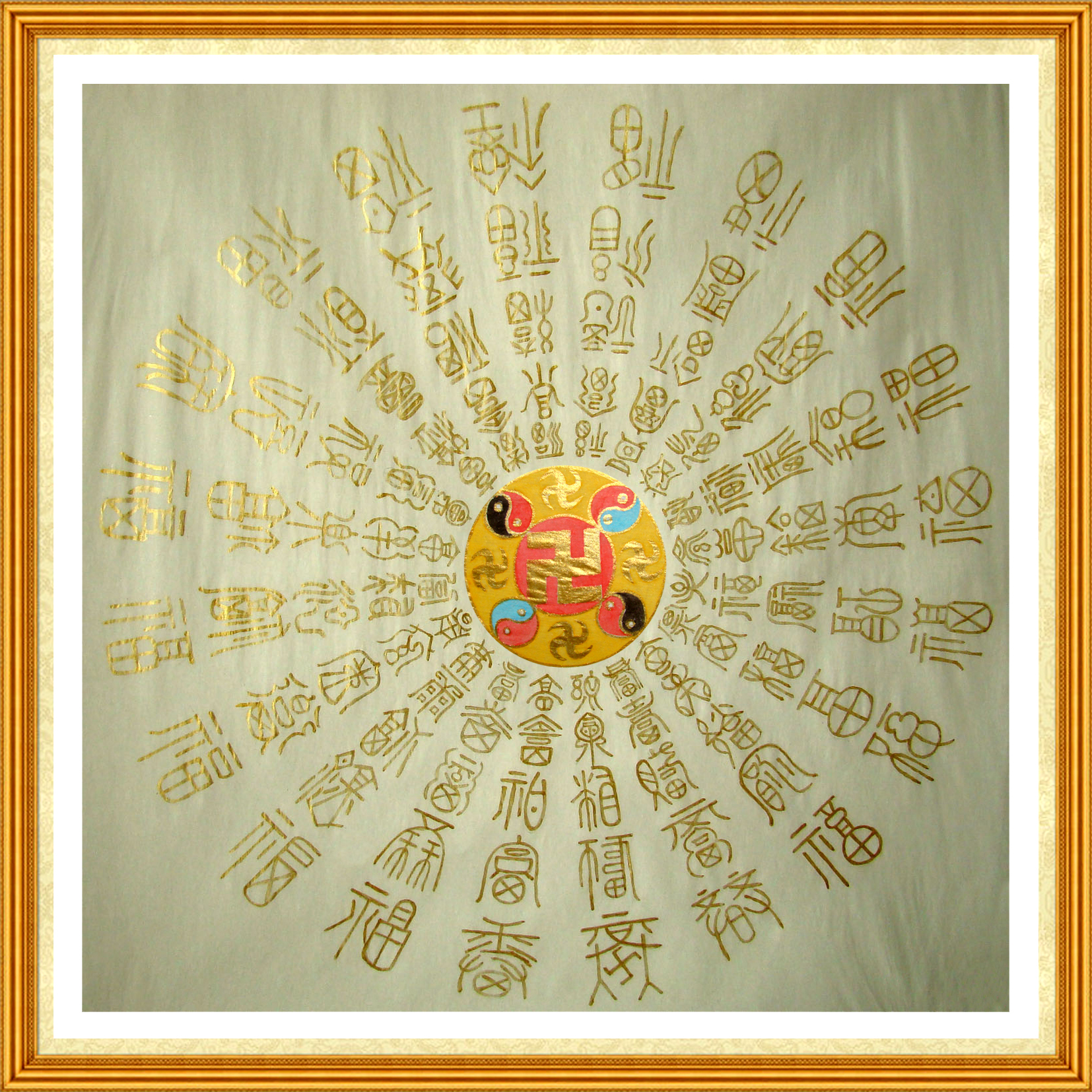 作品说明:中间是一个法轮,四周的福字是集古今各种篆体福字组成的。