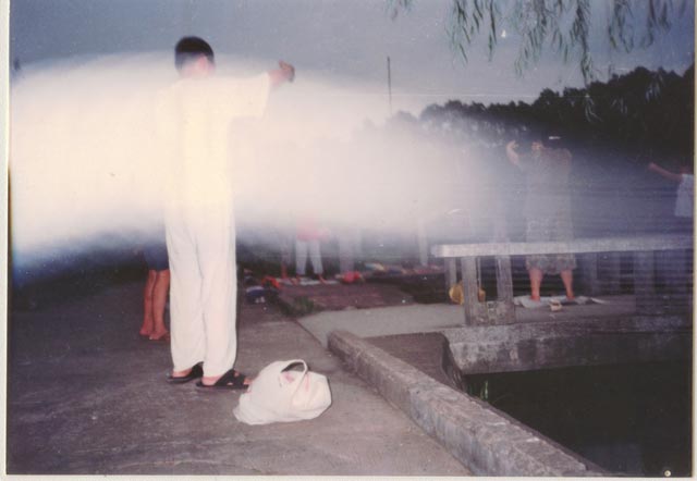 图二:一九九八年七月二十九日清晨,拍摄于湖南大学图书馆旁的法轮功炼功点,学员们正在炼第二套功法的“腹前抱轮”动作。照片中左下方,照相机拍到一个大光球(法轮) |
