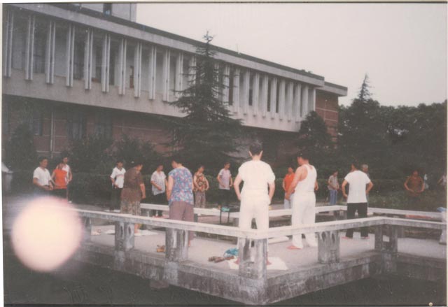 | 【明慧网二零一二年五月十九日】一九九五年法轮大法洪传到长沙,人们的口耳相传甚于任何广告效应,短短一两年间,长沙市各区就成立了数十个义务教功炼功点,位于长沙市岳麓区的湖南大学、中南大学、湖南师范大学、湖南财经学院等多家高校内也先后成立了炼功点。 当时,湖南大学炼功点的场地设在校图书馆旁边,每天早上都有几十人参加集体炼功,学员中包括教师、职工、教授、大学生、研究生以及离退休干部、教职工家属等。  图一:一九九八年七月二十九日清晨,拍摄于湖南大学图书馆旁的法轮功炼功点,学员们正在炼第二套功法的“头前抱轮”动作。当日为阴天,照片中清晰可见巨大的银白色光束(能量罩),笼罩着整个炼功点 |