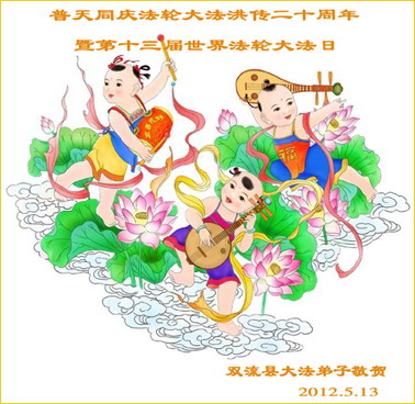 【明慧网二零一二年五月八日】每年的5月13日,世界各地的法轮大法弟子,都向明慧网寄来贺卡贺词,恭贺师尊华诞,并庆祝“世界法轮大法日”。今年的5月13日是大法洪传二十周年纪念日,中国以外的大法弟子纷纷举办各种活动庆祝大法洪传,将“法轮大法好”的信息传给更多世人。中国大陆的大法弟子通过明慧网发来贺信庆祝大法洪传二十周年、庆祝“世界法轮大法日”、恭贺师尊华诞,感谢师父的慈悲救度。这里是明慧编辑部已整理出来的部份来自中国大陆的贺信。天津宁河大法弟子学法小组庆祝法轮佛法洪传二十周年!普天同庆法轮大法日! 山东烟台福山全体老年大法弟子恭贺法轮大法洪传二十周年!