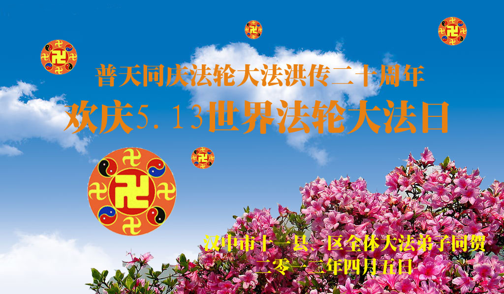 在大法洪传二十周年到来之际,绵阳弟子想念您,我们代表绵阳一方百姓感谢师尊慈悲救度,会时刻牢记自己的使命,在任何环境和形势下都不忘做好三件事,用实际行动迎接5.13二十周年大法日的到来。 陕西汉中十一县区全体大法弟子欢庆5.13世界法轮大法日!普天同庆法轮大法洪传二十周年!