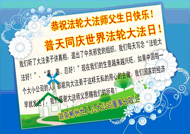 湖南郴州世人几大公司董事长恭祝法轮大法师父生日快乐!普天同庆世界法轮大法日!