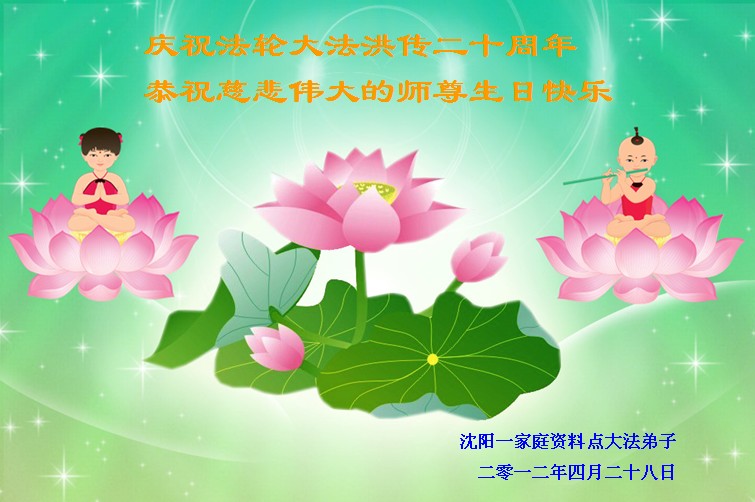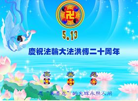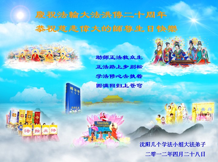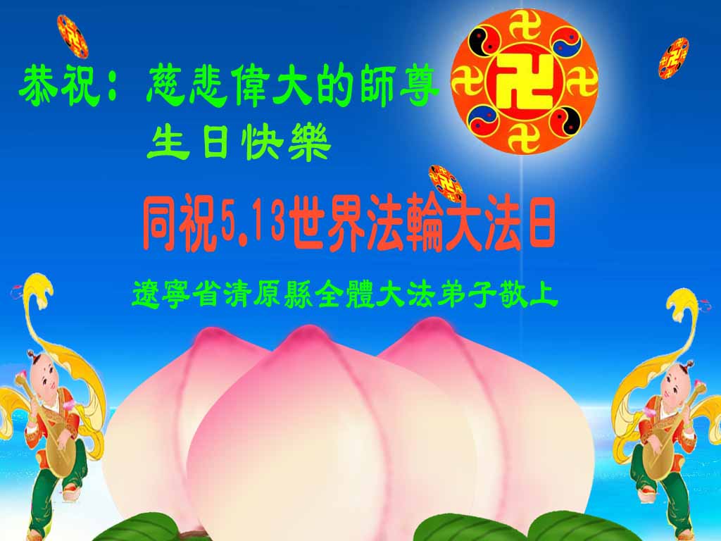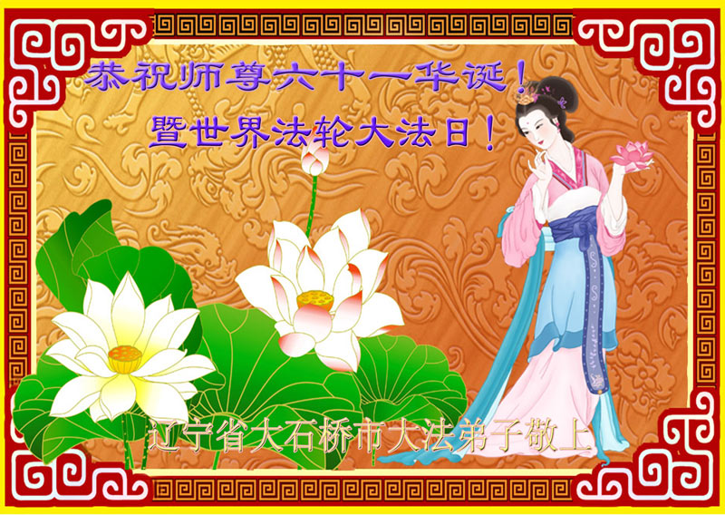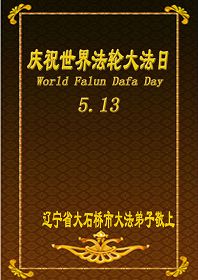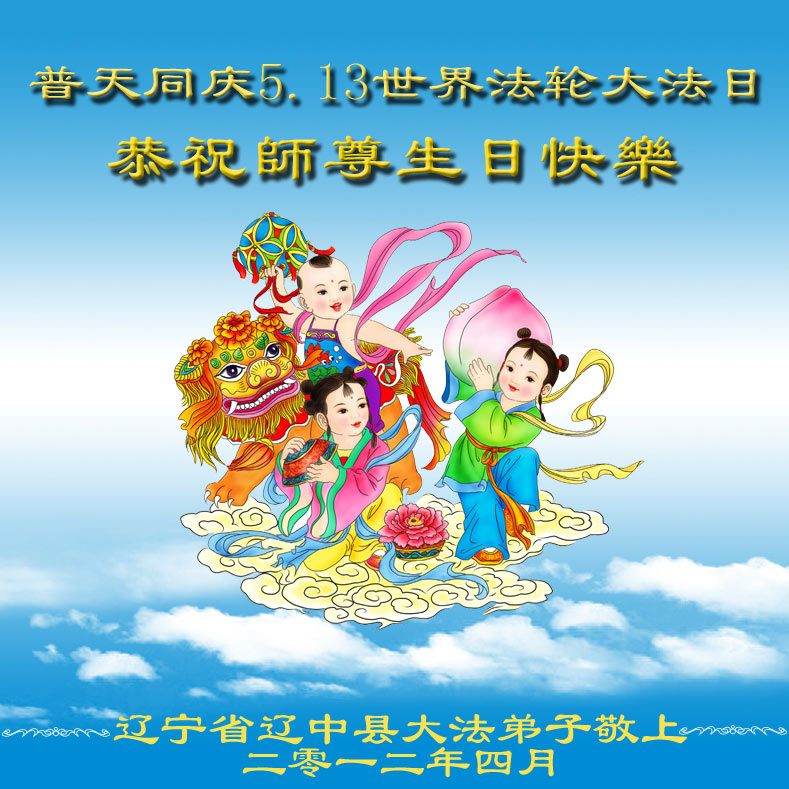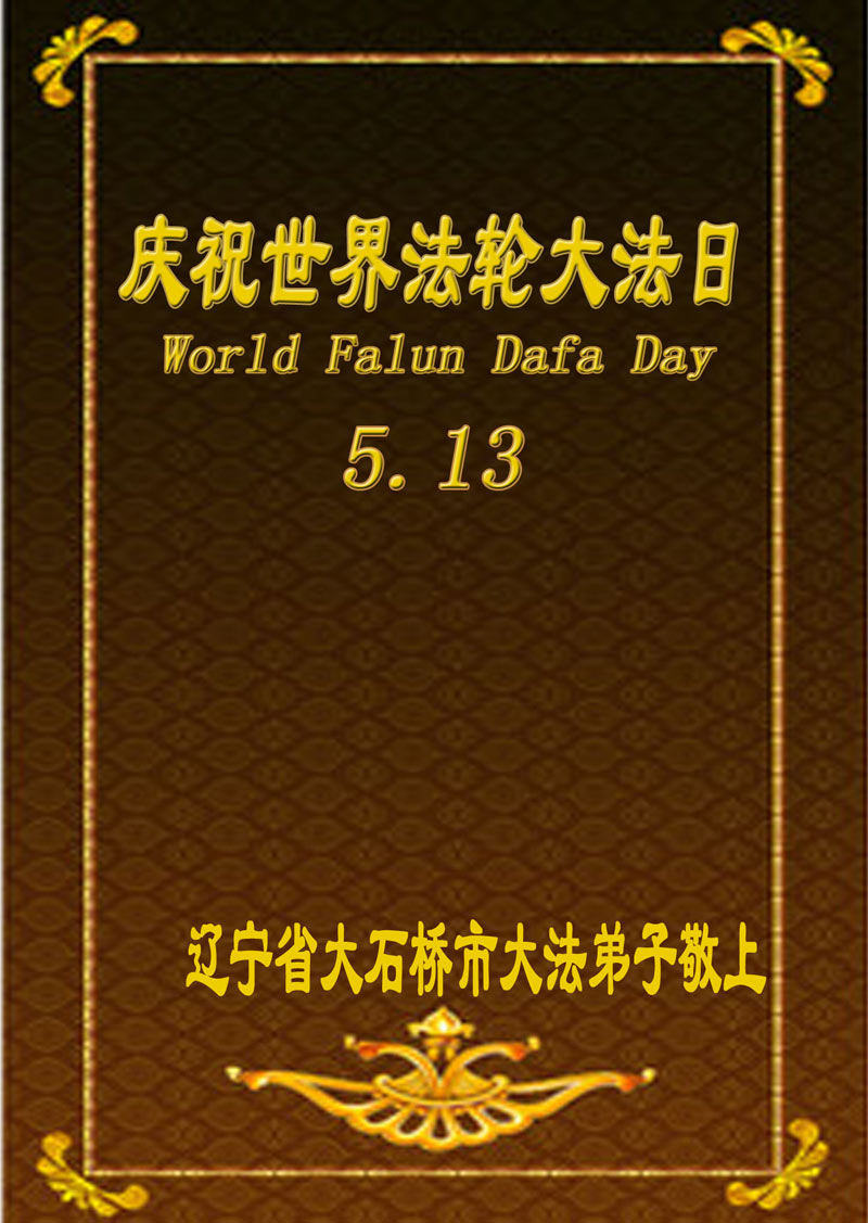 【明慧网二零一二年五月八日】每年的5月13日,世界各地的法轮大法弟子,都向明慧网寄来贺卡贺词,恭贺师尊华诞,并庆祝“世界法轮大法日”。今年的5月13日是大法洪传二十周年纪念日,中国以外的大法弟子纷纷举办各种活动庆祝大法洪传,将“法轮大法好”的信息传给更多世人。中国大陆的大法弟子通过明慧网发来贺信庆祝大法洪传二十周年、庆祝“世界法轮大法日”、恭贺师尊华诞,感谢师父的慈悲救度。这里是明慧编辑部已整理出来的东北地区大法弟子来信汇编:辽宁省营口市大石桥市大法弟子恭祝师父生日快乐暨世界法轮大法日!辽宁盘锦大法弟子恭贺师尊华诞暨世界法轮大法日!辽宁盘锦市大法弟子庆祝世界法轮大法日!辽宁盘锦大法弟子恭祝师尊华诞快乐!辽宁省营口市大石桥市大法弟子庆祝世界法轮大法日!辽宁清原学法小组同庆世界法轮大法日!在这普天同庆“法轮大法洪传二十周年”的伟大日子即将来临之际,我们会更加精進,做好三件事,圆满随师还。 辽宁省抚顺大法弟子普天同庆法轮大法洪传二十周年!