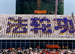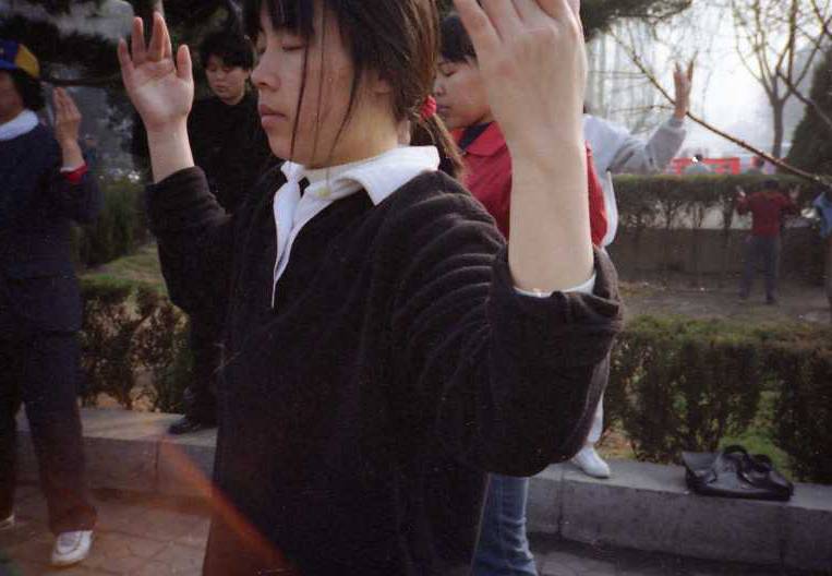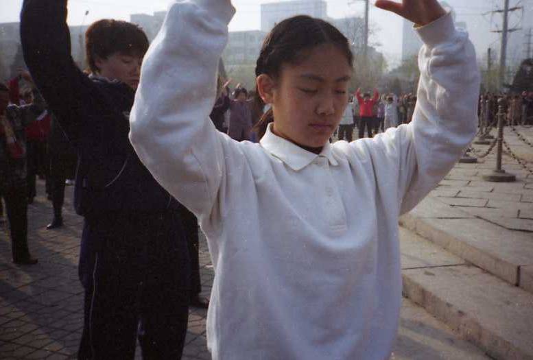 一九九九年四月初,几个炼功点的近千名法轮功学员在沈阳和平广场晨炼——炼功人群中的大学生。 |