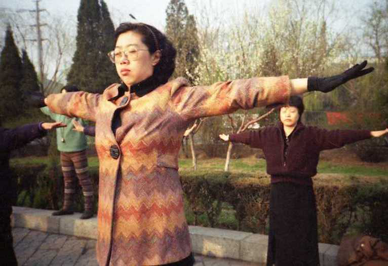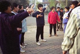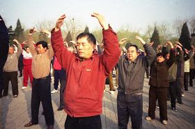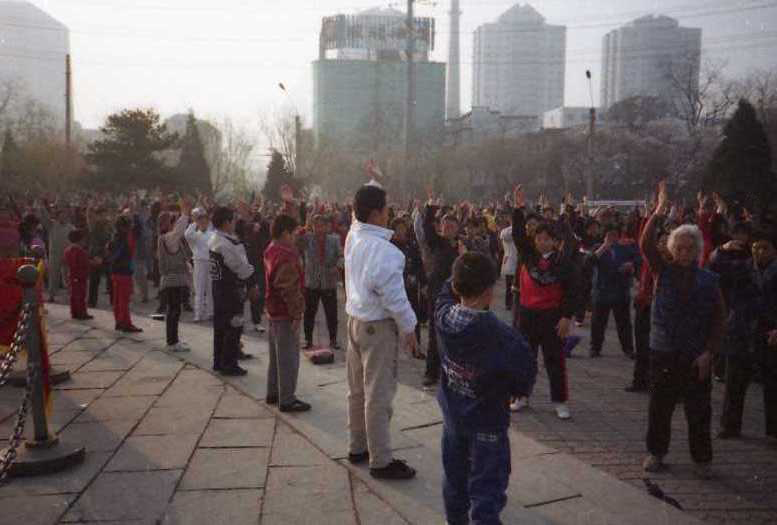 一九九九年四月初,几个炼功点的近千名法轮功学员在沈阳和平广场晨炼——炼功人群中的中年人。 |