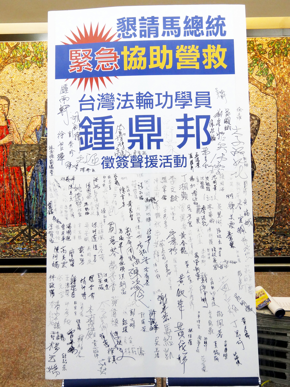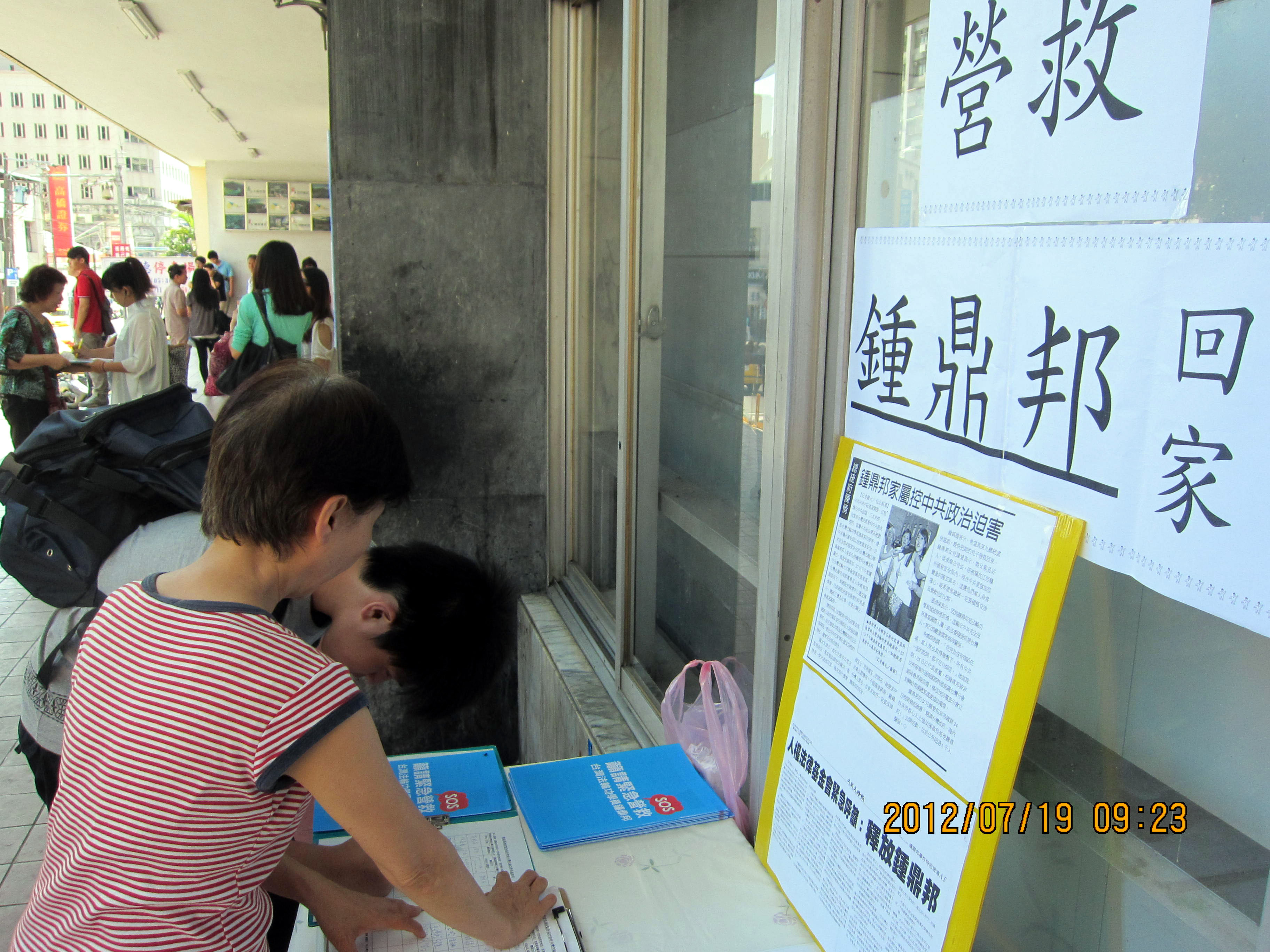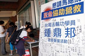 | 【明慧网二零一二年七月二十三日】(明慧记者黄宇生台湾桃园采访报道)台湾法轮功学员钟鼎邦先生,从大陆探亲返台时,于二零一二年六月十八日在机场被中共国安与六一零办公室非法拘留关押。到目前为止,已经超过一个月了,两岸家人无法探视钟先生或与其通电话,中共官媒新华网更发文罗织罪名,指钟先生涉嫌电视插播,控其“危害国家安全、公共安全”之重罪。 在没有律师保护其法律权利及人身安全的情况下,钟先生安危不明、处境堪虞。日前,钟先生的女儿钟爱和家人,已向国内外发出求助函,建立脸书、征求征签及盖手印等方式,呼吁民众和政府积极营救钟先生,现已有近万人响应。  营救钟鼎邦的签名展板汇集了民众的正义之声 |