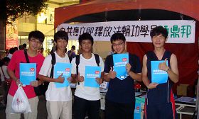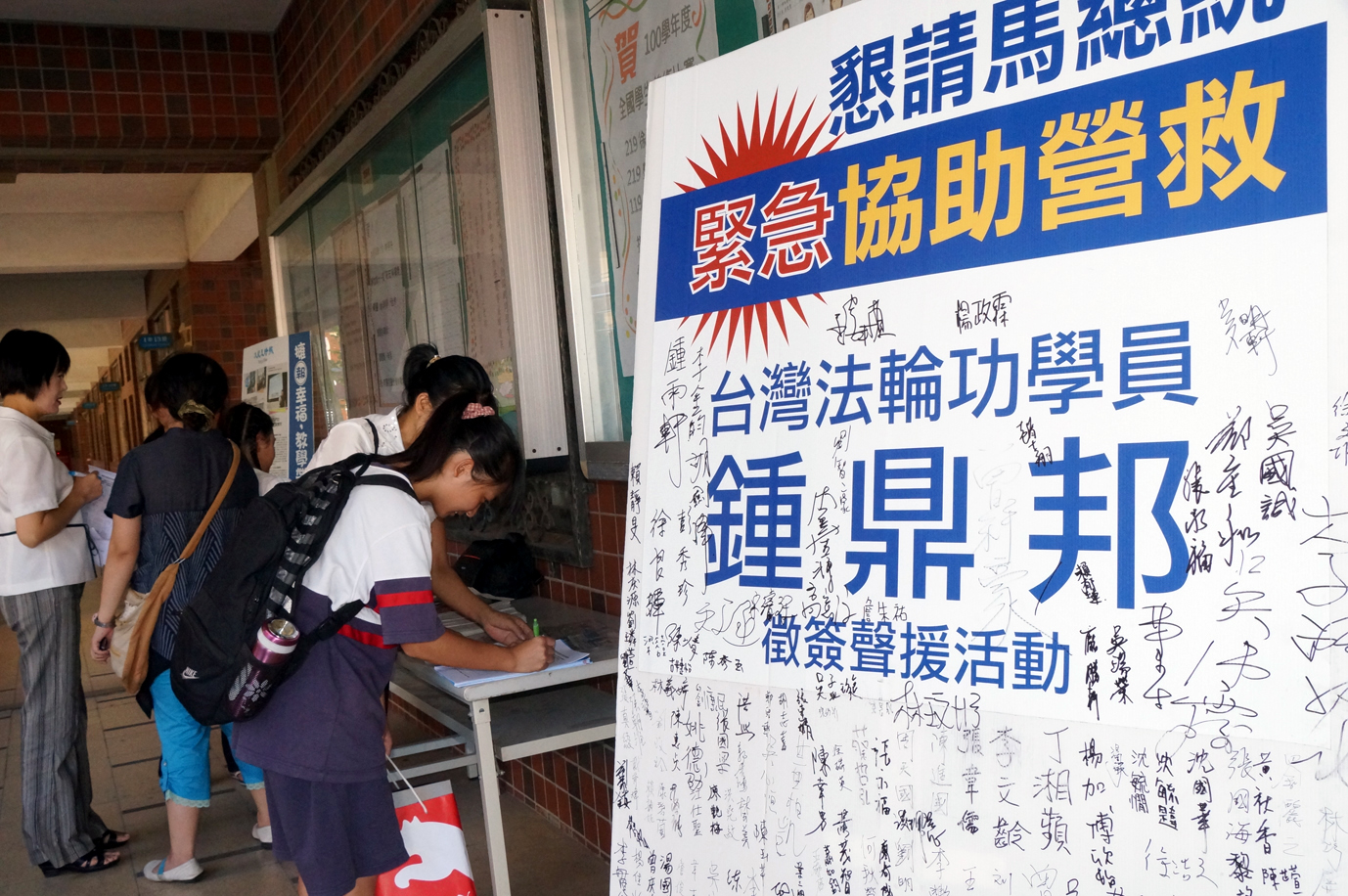 一位中山大学传播研究所学生,是实习记者,对于音乐会和人权征签的结合感到好奇,于是采访学校一名法轮功学员教师。经过了解,她才知道钟鼎邦案的新闻竟然被许多中资介入的媒体刻意回避,带着初生牛犊不畏虎的正义感,她知道一位媒体人该有的职业道德,以及还予百姓知道真相的权利,才能起到救人的效果,她说这使命“就交给我吧!”事后,她为了将报导写得完整,继续向学员了解更多包含天安门自焚真相、法轮功洪传、中国人民三:退.(退出中共党、团、队)大潮、插播等真相。 校园吹起正义之风 七月二十日,内坜高中毕业生返校参与大学考试分发入学志愿选填说明会,有近千名的学生返校。校长重视人权教育,支持校内法轮功教师学员在校园内举办征签活动,总务主任热情提供桌椅,在校园内摆设两个摊位,供学员讲真相征签时用。  了解真相的民众、学生纷纷签名支持营救钟鼎邦 |