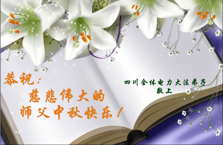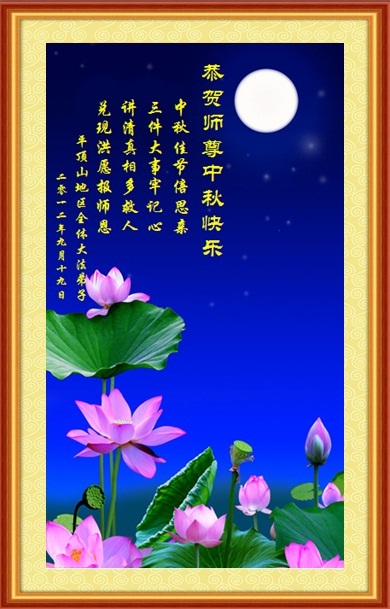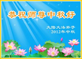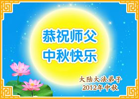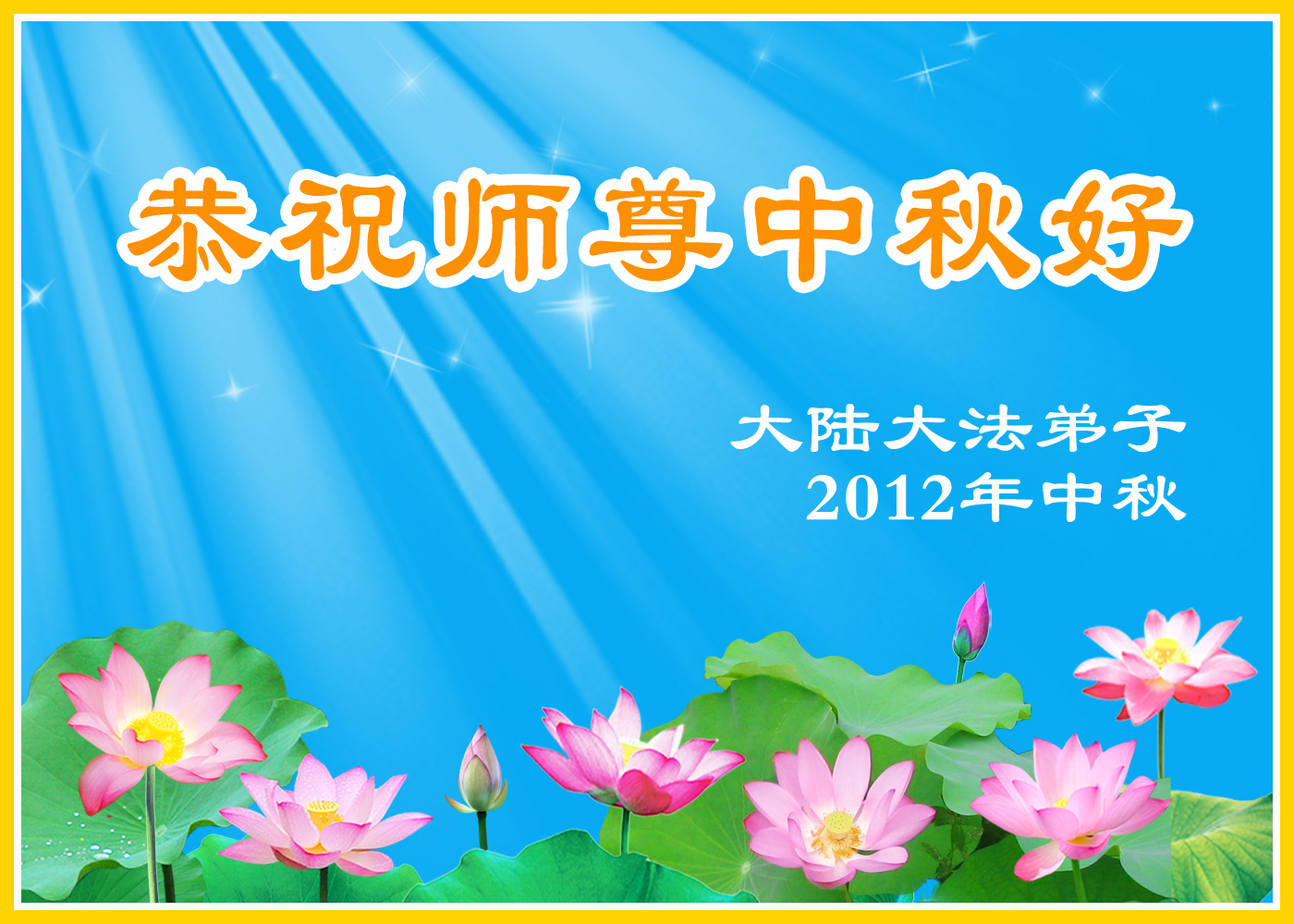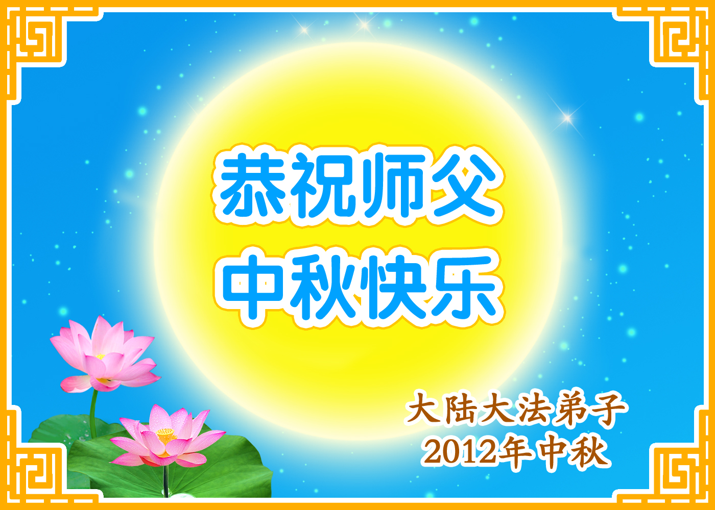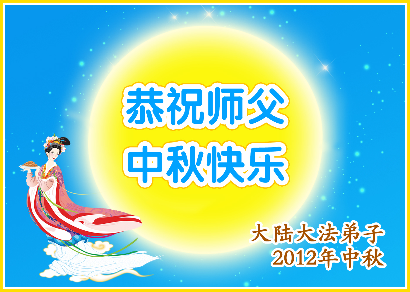 【明慧网二零一二年九月三十日】值此中秋佳节之际,中国大陆和国际上的大法弟子纷纷将发自内心的节日贺词、自制的贺卡、诗歌等寄给明慧网,恭祝慈悲无私的李洪志师尊中秋快乐,感谢师尊的救度之恩。师父辛苦了!弟子们要谨记大法弟子的责任,学好法,向内找修自己,配合好,真正的助师正法,救度众生,不负师恩。