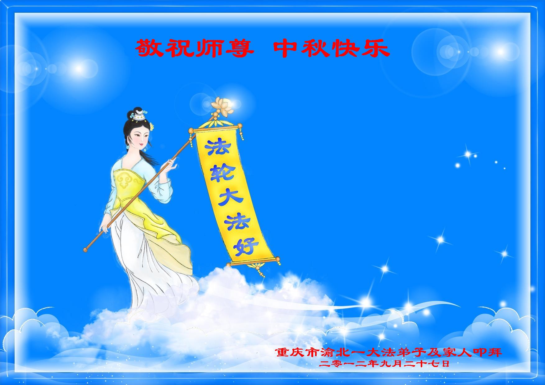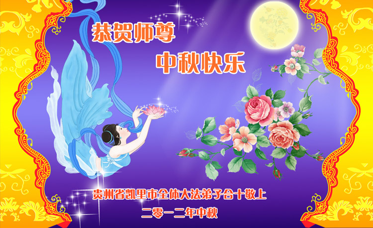 【明慧网二零一二年九月三十日】值此中秋佳节之际,中国大陆和海外的大法弟子纷纷寄来贺卡贺词,恭祝慈悲伟大的师尊中秋快乐,感谢师尊的慈悲救度。以下是部分大陆大法弟子的贺卡和贺词。 大陆一对新婚大法弟子祝师父中秋佳节快乐!