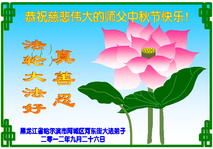 慈悲伟大的师父:中秋节好!在十几年的修炼历程中,越来越体悟到师父在正法中,为拯救穹宇、救度苍生真的不易,您的付出用人类的语言是无法表达的!弟子在此道一声:师父您辛苦了!谢谢师父!在师父正法的最后的最后的时刻,弟子一定做好弟子该做的三件事,圆容好师父所要的,不错过一切机缘,多救度众生。不辜负师父的慈悲救度!完成大法弟子的历史使命!跟师父回家!谢谢师父!谢谢师父! 山东烟台芝罘区全体大法弟子敬上 二零一二年九月二十七日 黑龙江省齐齐哈尔市建华区三人学法小组恭祝慈悲伟大的师尊中秋节快乐