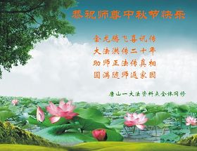 我于九五年得法至今已十七载,伟大的师父无时无刻不在呵护和加持着我。我心里有感恩师父的话,但用常人的语言无法言表,在这里我只能说师父您好!您辛苦了!以后我要时刻铭记您的教诲,修己救人不放松。希望伟大的师父多一些欣慰,少一些操劳。伟大的师父传大法度我,费尽了苦心,深感佛恩浩荡。叩拜谢师恩! 河北省唐山一资料点全体大法弟子恭祝师尊中秋节快乐!
