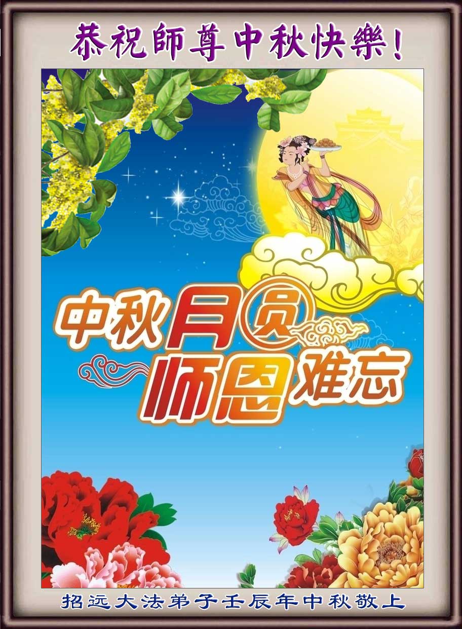 悠悠万世,辗转轮回,盼师尊。 万苦艰辛,佛恩浩瀚,开天门。 中秋佳节,无以回报,师徒恩。 大洋彼岸,随卡相寄,弟子心。 湖北咸宁一学法小组全体大法弟子恭祝慈悲伟大的师尊中秋节快乐!