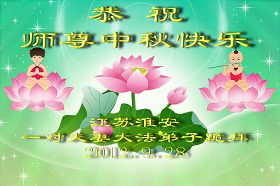 师父辛苦了!感谢师父改变了我的命运。我九七年有幸走進了大法修炼,是大法洗净了我的心灵,师父把我一个心灵肮脏的人改变成一个干净健康的新人。师父啊!如果我不遇上大法修炼,不知我现在堕落到什么程度了,很可耻的下场啊。我和大家走到了今天,请师父放心,我们一定不负师父的慈悲苦度,不忘来时的洪愿,做好三件事,做一个合格的正法时期的大法弟子。 大陆大法弟子法生恭祝师尊中秋节快乐!