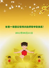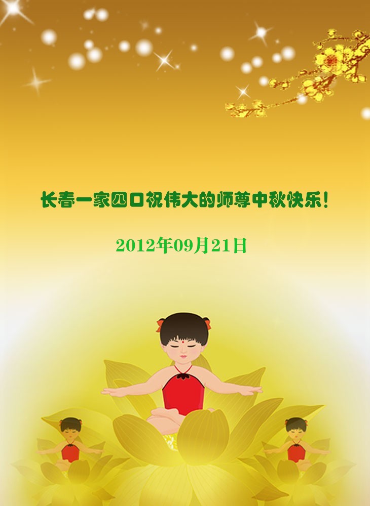 中秋节到了:祝师尊中秋快乐! 遥远天际为法来, 落入红尘志未衰。 师尊洪恩慈悲护, 快救众生飞天外。 双鸭山大法弟子 二零一二年九月二十一日 黄州大法弟子及家人恭贺师父秋佳节快乐!