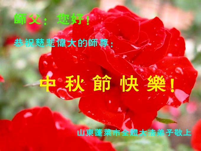 尊敬的师父您好! 我们老俩口代表全家十几口向师父问好! 每逢佳节之际,我们非常想念师父,师父您为众生操尽了心,您的恩情比天高、比海深。我们老俩口今生能成为您的弟子,真是天大的荣幸,我们一定珍惜这份伟大的圣缘,听师父的话,走正走好今后的路,跟师父回家。 二零一二年九月二十二日 山东省烟台市招远市一学法小组大法弟子叩拜师尊,恭祝慈悲伟大的师尊中秋节幸福快乐!