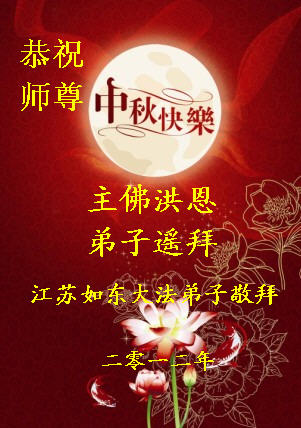 谢谢师尊慈悲普度!我们一定会在修炼的路上把住三件事越走越好,请师尊放心。 2012中秋赋 中秋月似瑶台镜 全球灾难频频生 老天慈悲在示警 世人快醒快快醒 大法弟子讲真相 不畏生死不为名 记住法轮大法好 大难道时能保命 2012年9月16日 江苏大法弟子恭祝无上慈悲的师父中秋快乐!