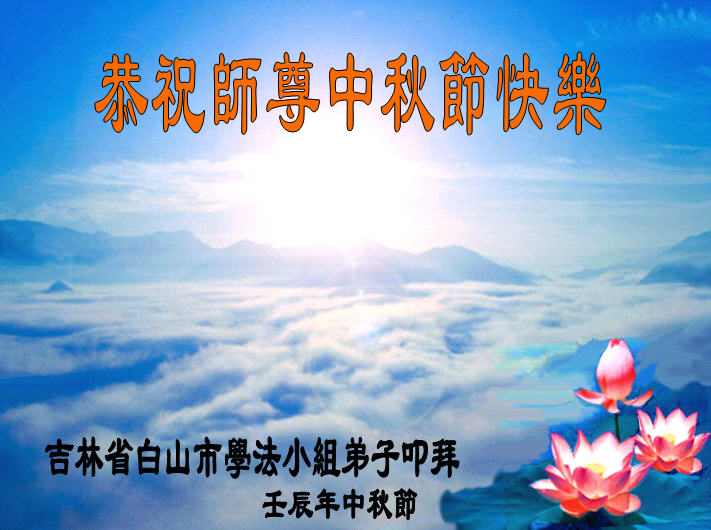 值此一年一度的中秋佳节到来之际,我们吉林市的全体大法弟子恭祝慈悲伟大的师尊中秋节快乐!师尊您辛苦了! 在这助师正法的最后时期,我们要牢记师尊的讲法:“中秋添正念”!多学法、学好法,向内找,修好自己,做好三件事,正念正行,走正修炼路,兑现史前誓约,不辜负师尊的慈悲苦度。 吉林市全体大法弟子跪拜敬上! 二零一二年九月十九日 辽宁省丹东大法弟子恭祝师尊中秋快乐!