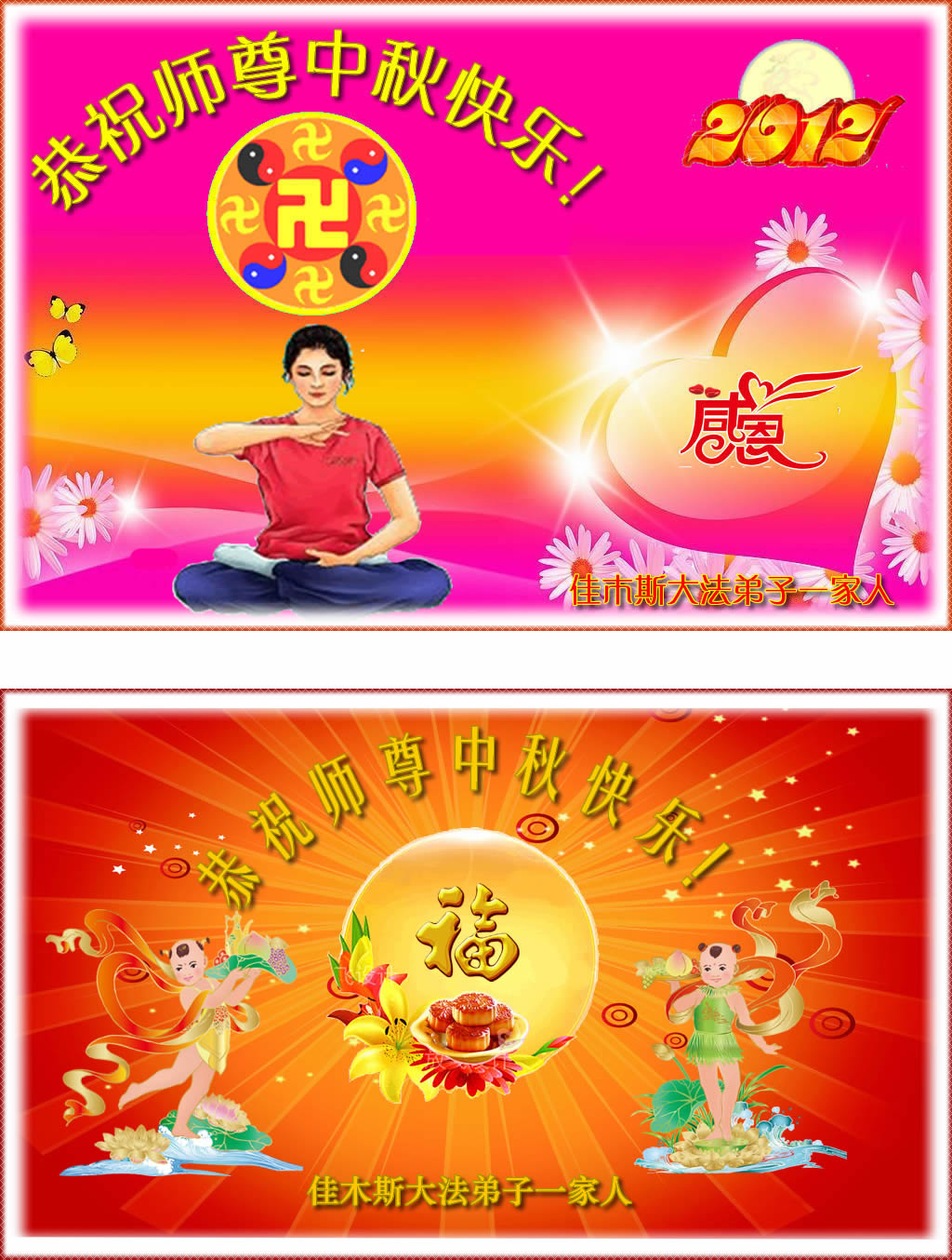 恭祝伟大师尊中秋快乐师尊传法 法正人间 弟子学法 孜孜不倦 学《转法轮》已有千遍 宇宙法理 层层展现 去掉自我 心有善念 救度众生 兑现誓言 讲清真相 真理召唤 快上法船 幸福平安 学好大法 神迹神念 助师正法 千锤百炼 报答师恩 永远无限 祝师快乐 随师回天 佳木斯大法弟子 2012 中秋节 黑龙江省佳木斯大法弟子一家人恭祝伟大师尊中秋快乐!