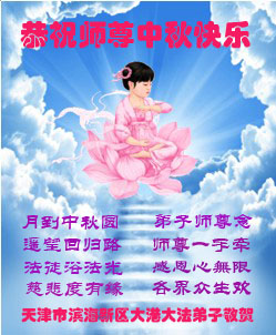 天津市滨海新区大法弟子恭祝师尊中秋快乐!月到中秋圆 弟子师尊念 遥望回归路 师尊一手牵 法徒浴法光 感恩心无限 慈悲度有缘 各界众生欢