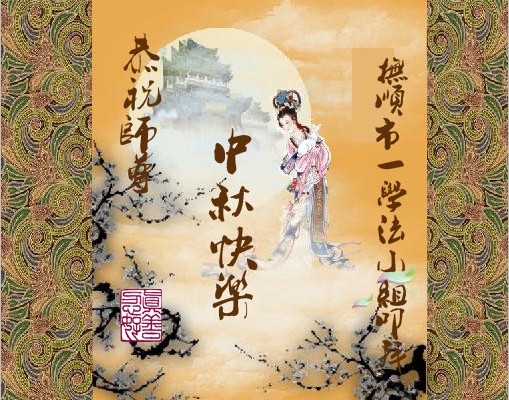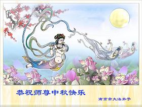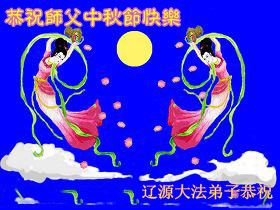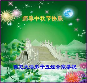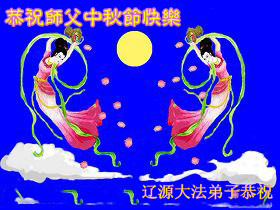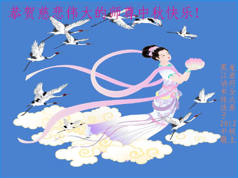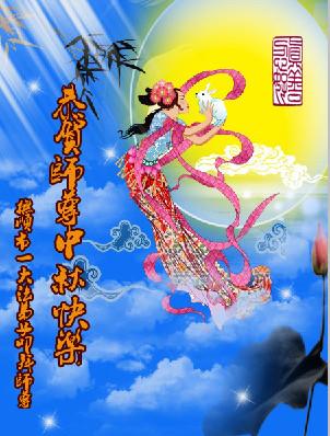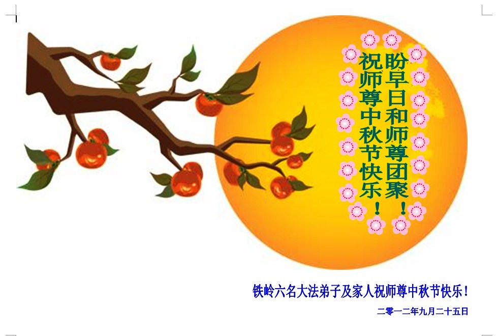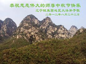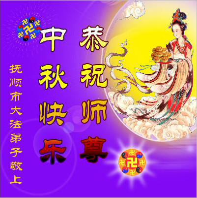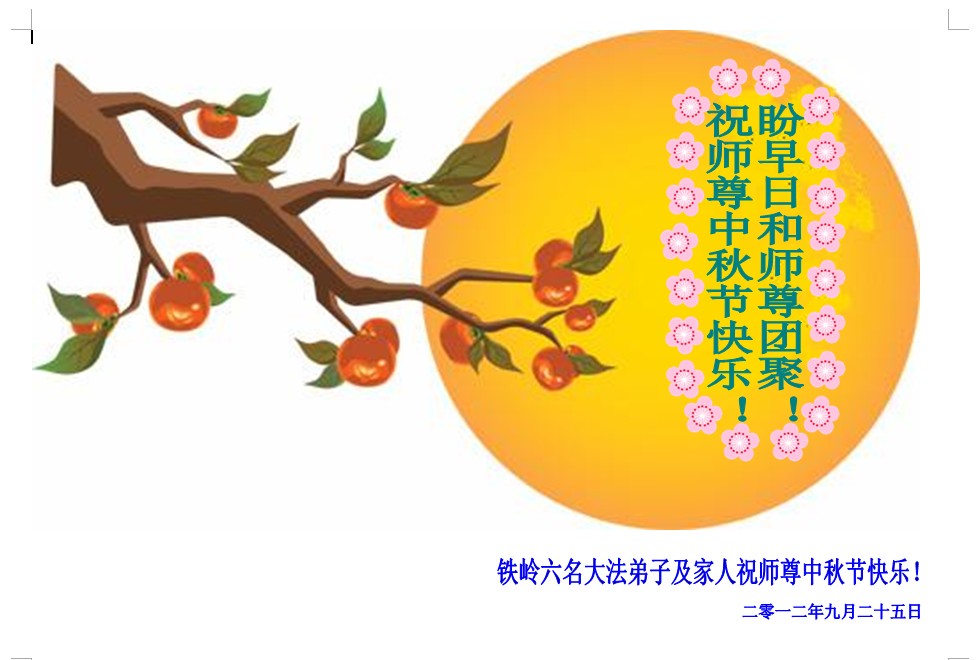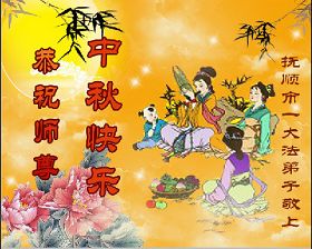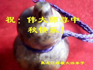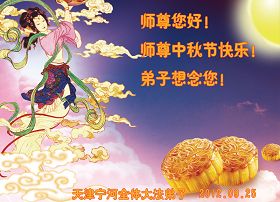 辽宁大连甘井子区一大法弟子敬祝师尊中秋节快乐!敬祝伟大的恩师中秋节快乐! 师尊啊:在举家团圆的节日里,弟子倍觉想念师尊。泪水像断了线的珠子一样顺腮流淌……。 是师尊拯救了我,把我从地狱里拯救出来洗净,让我知道了那么多的法理,走上一条返本归真的修炼之路,路途中有坎坷,有迷茫,摔过跟头,但是,法轮大法的法理一直在我的微观中给我指引着精進的修炼之路, 师尊,在这师徒团圆的日子里,弟子敬祝师尊中秋节快乐!弟子谨遵师嘱:“生在苦难中 半生两袖空 一朝得法向上冲 快 做好三件事 救众生 回归步别松”(《洪吟三》〈观感〉) 大陆辽宁大连甘井子区一大法弟子敬上 2012.9.24