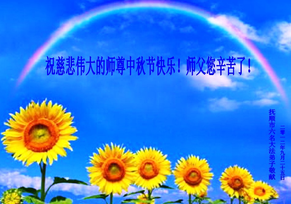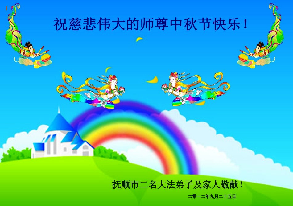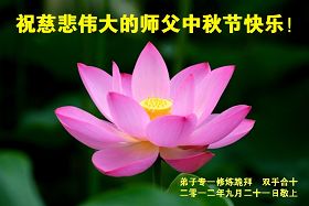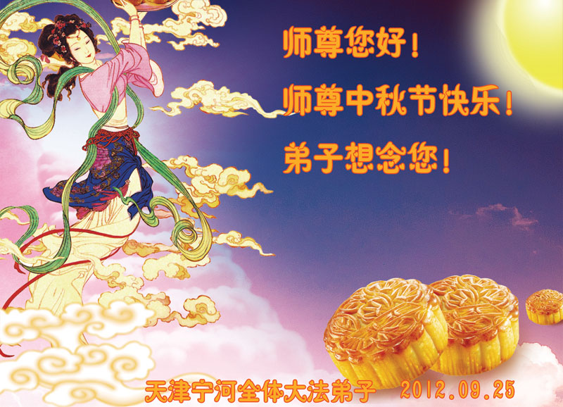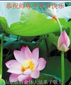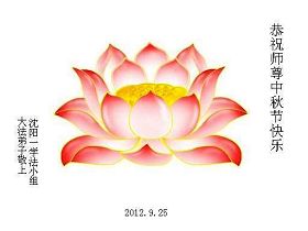 山东省青岛大法弟子恭祝慈悲伟大的师尊中秋节快乐!师父您好:青岛大法弟子非常想念您,盼望早日跟师父回家。 我们一定记住师父的话,做好三件事。恭祝慈悲伟大的师父中秋节快乐! 青岛大法弟子 2012.9.24