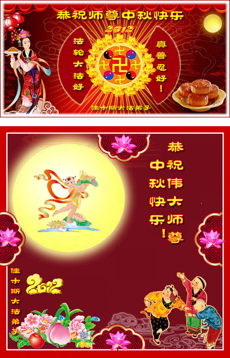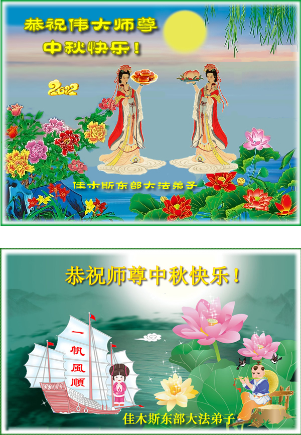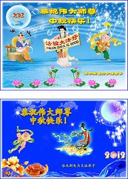 【明慧网二零一二年九月三十日】值此中秋佳节之际,中国大陆和海外的大法弟子纷纷寄来贺卡贺词,恭祝慈悲伟大的师尊中秋快乐,感谢师尊的慈悲救度。以下是部分大陆大法弟子的贺卡和贺词。 弟子专一修炼祝慈悲伟大的师父中秋节快乐! 辽宁省沈阳一学法小组大法弟子恭祝师尊中秋节快乐! 黑龙江省哈尔滨大法弟子圣缘恭祝师尊中秋快乐! 辽宁省抚顺六名大法弟子祝慈悲伟大的师尊中秋节快乐! 辽宁省抚顺一全家大法弟子祝慈悲伟大的师尊中秋节快乐! 山东省潍坊大法弟子恭祝师尊中秋节快乐! 山东省潍坊昌乐大法弟子恭祝师尊中秋快乐! 辽宁省抚顺两名大法弟子及家人祝慈悲伟大的师尊中秋节快乐! 辽宁省丹东市凤城市大法弟子恭祝师尊中秋节快乐! 辽宁省抚顺一大法弟子恭祝师尊中秋节快乐!在这中秋佳节之际,弟子非常想念师父!在今后弟子一定多学法,学好法,做好三件事,跟师父回家。 辽宁省铁岭六名大法弟子及家人祝师尊中秋节快乐! 黑龙江省哈尔滨市香坊区一学法小组全体大法弟子祝师父中秋节快乐! 黑龙江省齐齐哈尔市讷河市全体大法弟子恭祝慈悲伟大的师父中秋快乐!讷河市全体大法弟子道一声:“师尊辛苦了!”师父放心,我们会坚定的修下去,在法中不断的修正自己,形成整体,比学比修,用师父赋予的神通排除一切干扰,做好三件事,圆满随师还! 山东省聊城市临清市全体大法弟子恭祝师尊中秋节快乐!弟子谨记师尊教诲,不辜负师尊的慈悲救度,不辜负助师的历史使命,不辜负众生的热切期盼,勇猛精進,做一个合格的大法徒。 山东荣成大法弟子恭祝伟大师尊中秋快乐! 山东荣成大法弟子恭祝伟大师尊中秋快乐! 黑龙江省佳木斯佳东大法弟子恭祝伟大师尊中秋快乐!此生为法来,万古的等待。 弟子沐佛光,处处莲花开。 助师世间行,救人出苦海。 中秋向师拜,叩首慈悲怀。 黑龙江省佳木斯大法弟子恭祝伟大师尊中秋快乐!中秋佳节明月,大法亿万人学。 伟大师尊救度,铸就金刚大觉。 弟子兑现誓约,助师救人多些。 人神欢呼热烈,师尊快乐过节。