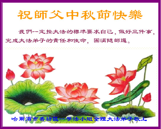 湖北省武汉市黄陂区大法弟子恭祝师尊中秋节快乐!在此万家团圆之际,我们是多么盼望师尊早日回中原呀! 师尊您为救众生吃了无数苦,当我看到《加拿大法会讲法》中的一段法,师尊为了替一个学员承担罪业,喝了一碗毒药时,我泪如泉涌,师恩难报呀!我们一定要放下自我整体配合好,默默圆容好师尊所要的,真正做到静心学好法,净心发好正念,尽心做好大法项目,不负誓约助师正法,救度更多的众生,完成史前大愿。敬请师尊放心! 二零一二年九月二十一日