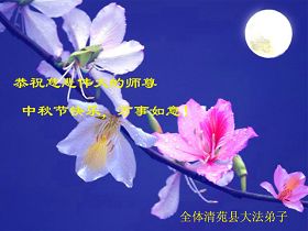 中秋节到了,诸城大法弟子一家三人紧跟师父正法進程,努力做好大法弟子的分内事。在此问候师尊好,恭祝师尊中秋节快乐! 辽宁省大连大法弟子恭祝师尊中秋节快乐!