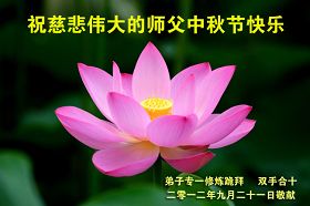 尊敬的师尊您好: 在中秋佳节到来之际,弟子叩拜师尊,祝福师尊节日快乐。师尊为弟子们操尽了心,弟子也无法用语言来表达对师尊的感激之心只有百分之百的信师信法,踏踏实实的修炼努力做好三件事,争取每天都向师尊汇报好消息。不辜负师尊的慈悲苦度。 长春市大法弟子 二零一二年九月二十五日 山西省晋城市俩人学法小组大法弟子恭祝慈悲伟大的师尊中秋节快乐!