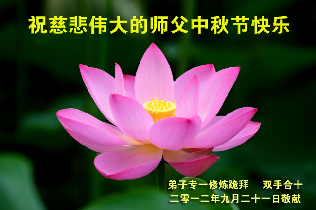 千言万语难述恩, 数世结缘为救人, 天地轮回更替日, 洪愿挥手满宇金。 喜看法徒全球走, 众生得度有章循, 邪恶除尽在眉睫, 一轮浩月弟子心。 吉林辽源大法弟子 二零一二年九月二十五日跪拜 又是一个中秋佳节来临,山东省烟台市蓬莱市大法弟子祝师父中秋快乐!