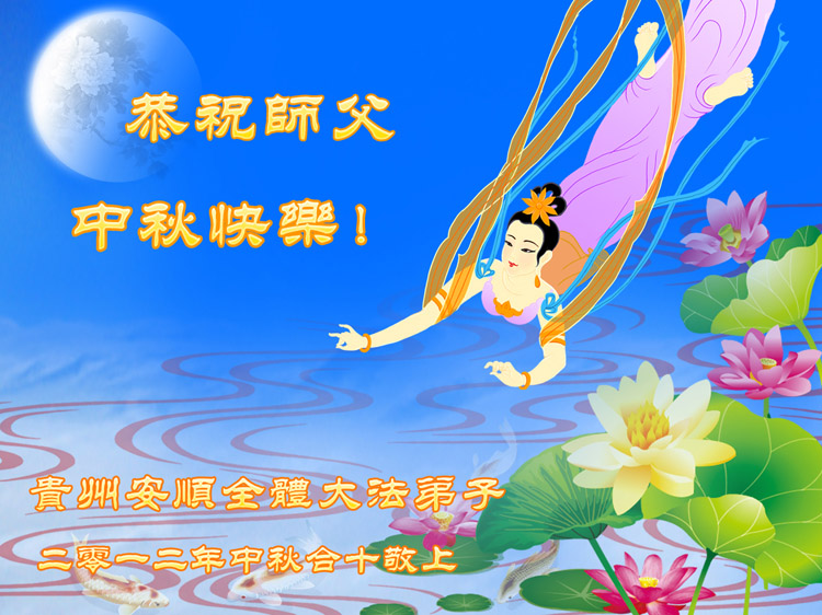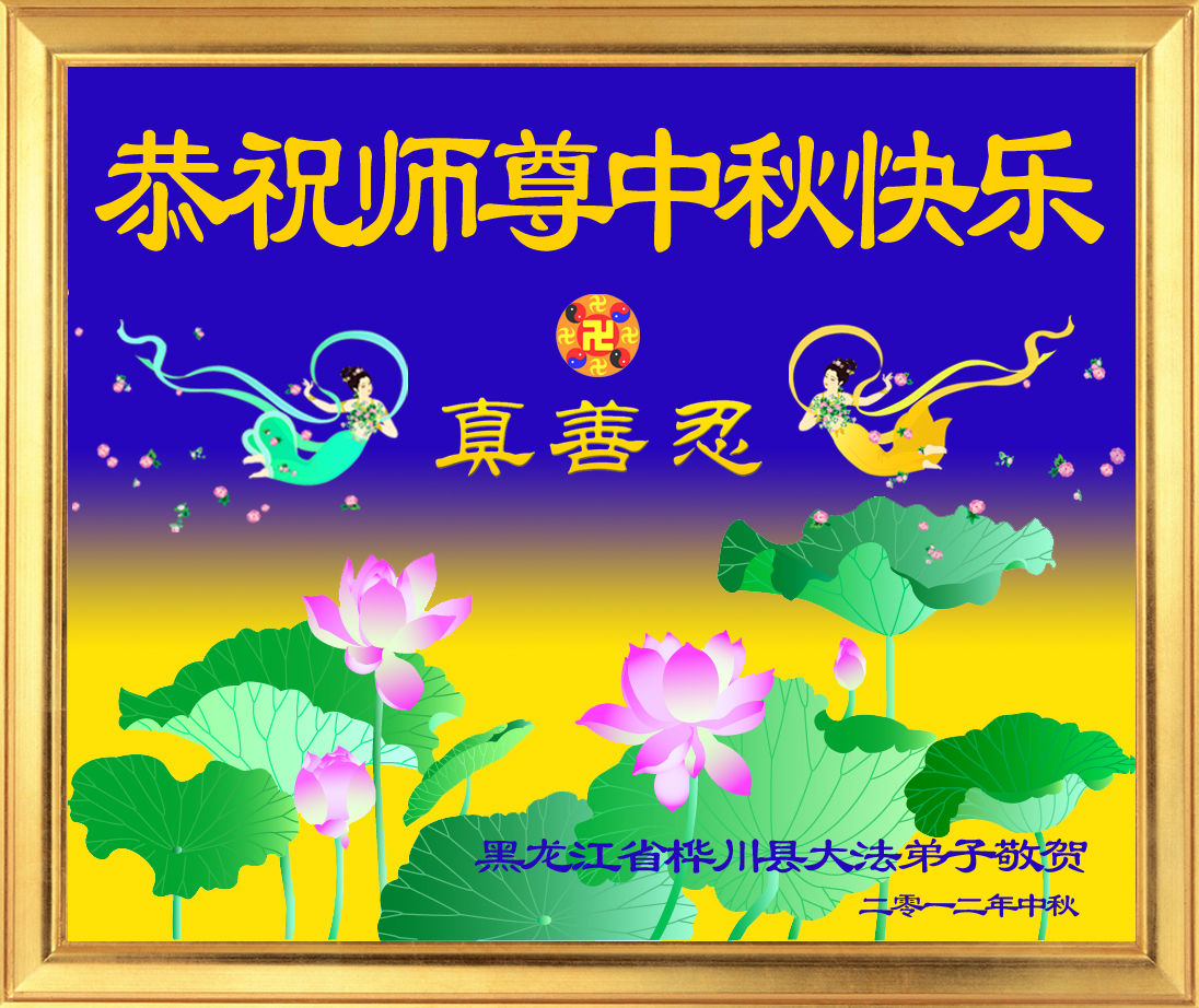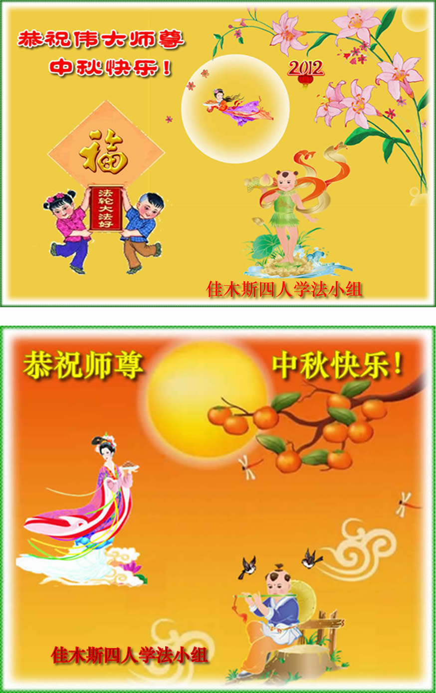 【明慧网二零一二年九月三十日】值此中秋佳节之际,中国大陆和海外的大法弟子纷纷寄来贺卡贺词,恭祝慈悲伟大的师尊中秋快乐,感谢师尊的慈悲救度。以下是部分大陆大法弟子的贺卡和贺词。 黑龙江省佳木斯市桦川县大法弟子恭祝师尊中秋快乐!